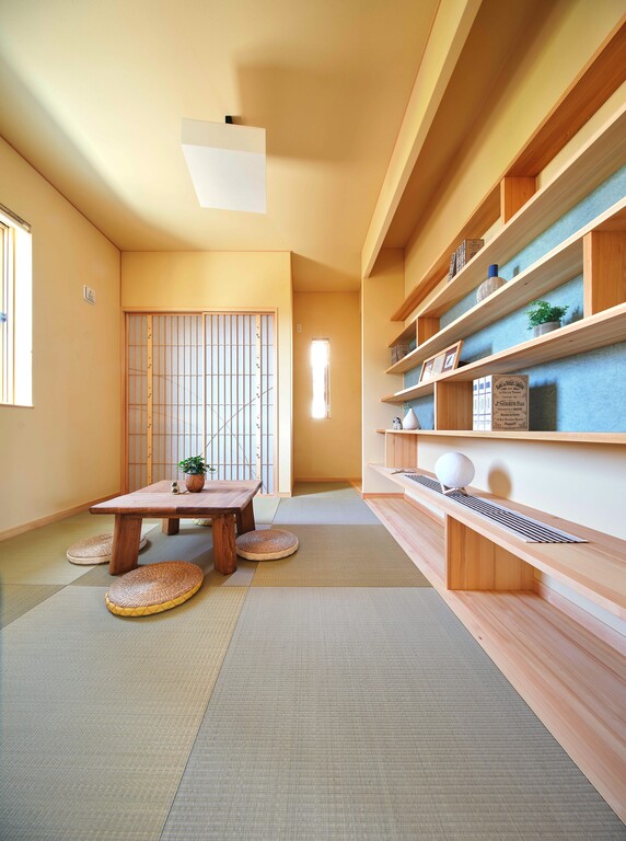 LDKに隣接したバリアフリー和室は、可変性のある間取りで、普段は落ち着いたリビングスペースとして、来客時には畳を活かしたおもてなしのお部屋として利用できる使い勝手の良い空間です。木のぬくもりと繊細なアクセントが融合し、どんなシーンでも心地良さを提供します。