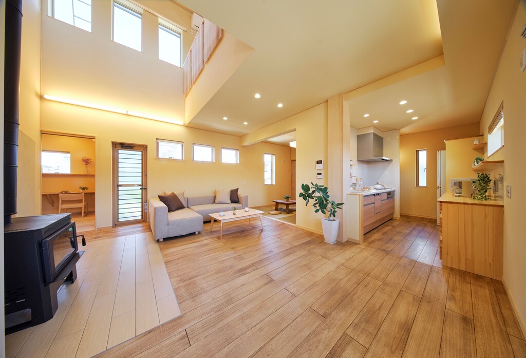 天然木をふんだんに使用した大空間は、時間を忘れるほど心地よい雰囲気を演出します。窓からは自然光がたっぷりと入り込み、部屋全体を優しく包み込みます。風通しの良い設計が、季節の移ろいを肌で感じさせ、忙しい日常に癒しの時間を提供します。明るいリビングスペースでの家族団らんや友人との集まりがさらに豊かになります。