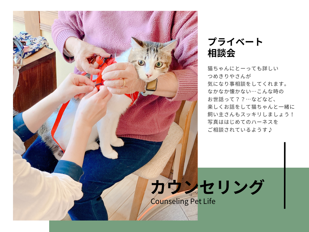 猫ちゃんの爪切り施術と、飼い主さんのお悩みに親身に対応するプライベート相談会です。猫ちゃん自慢の話題も大歓迎!