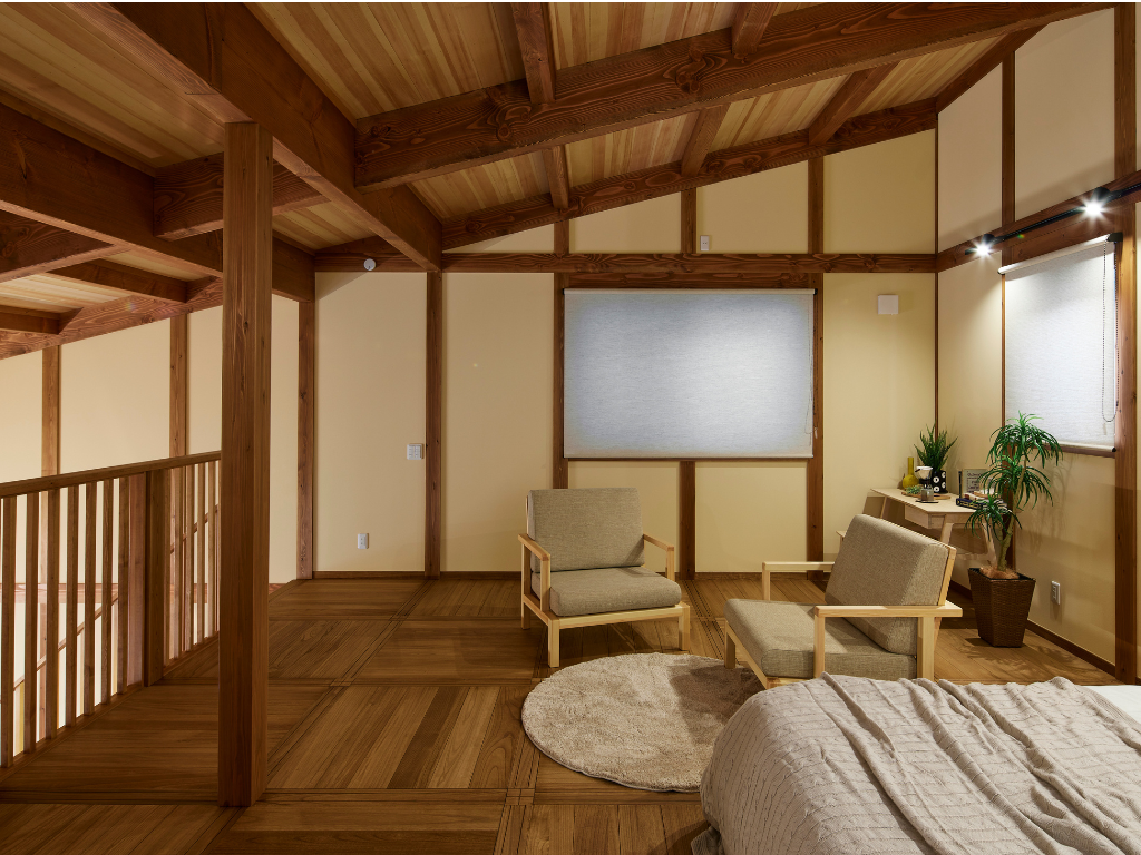 無垢材をふんだんに使った寝室は、自然の香りと温もりに包まれ、深いリラックスをもたらします。